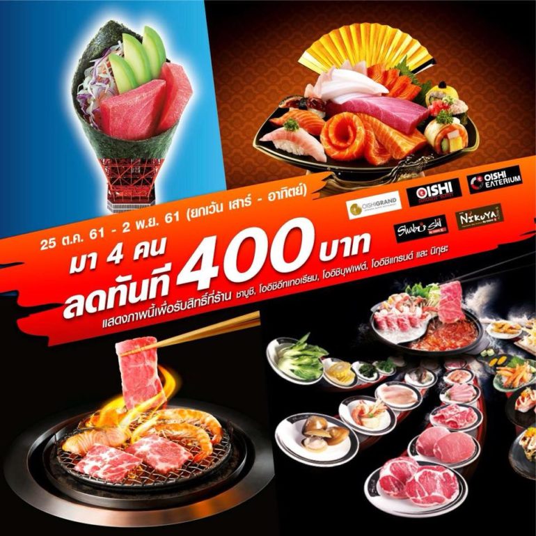 Oishi จัดโปรฯปังๆสำหรับคอบุฟเฟต์ ชวนเพื่อนไปทานให้ครบ 4 คน เพียงโชว์ภาพนี้รับส่วนลดไปเลยทันที 400 บาท