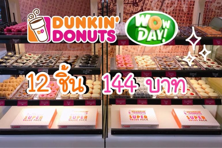 Dunkin Donuts Wow Day ชุดโดนัท 12 ชิ้นลดเหลือแค่ 144 บาท หารออกมาตกชิ้นละ แค่ 12 บาท จะซื้อฝากลูกฝากหลาน หรือจะแบ่งกันกินเป็นของว่างในออฟฟิศช่วงบ่ายๆก็ดีเลย