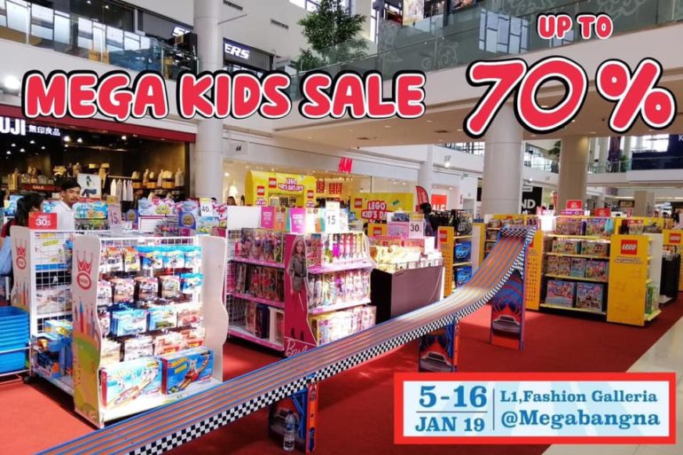 งาน Mega Kids Sale ลดสูงสุด 70% พบสินค้าเด็กเด็ดๆให้เลือกสรรมากมาย ทั้ง เสื้อผ้า รองเท้า ของเล่นลิขสิทธิ์ อาทิ Guess,young athletes, Kiddo Land, Anello, DOJO, Royal Baby, Lego และ AIIZ