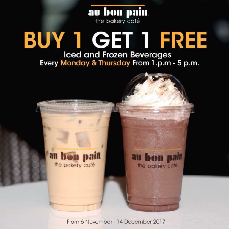 Food & Drink Au bon pain ซื้อ 1 แถม 1 เครื่องดื่มเย็นหรือปั่นทุกรายการ ซื้อ 1 แถม 1 ฟรี ทุกวันจันทร์ และพฤหัสบดี ตั้งแต่ 13.00-17.00 น. วันนี้ – 14 ธ.ค.นี้ ทุกสาขา ยกเว้นสาขาหน้าพระลาน admonsale